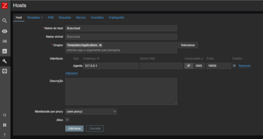 • No segundo campo, pesquise por “Brascloud” para consultar o template com instalação recente, e clique para associar ao host.