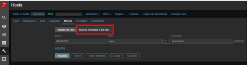 • Procure o host que acabou de criar, clique no mesmo e vá até a aba de “Macros”. Ao abrir as macros, clique em “Macros herdadas e do host”, conforme imagem abaixo: