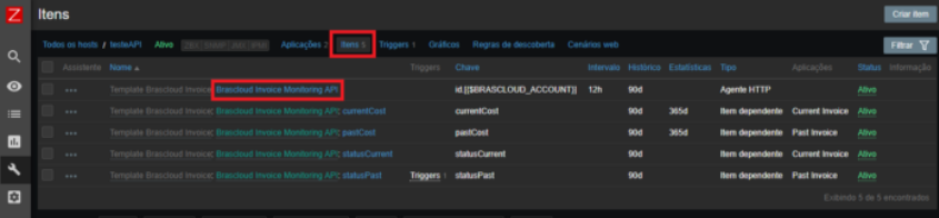 É importante destacar que esse template tem o objetivo específico de apenas monitorar a fatura atual e a anterior, com o objetivo de evitar suspensões de conta por falta de pagamento, por exemplo. Tanto que, quando houver fatura vencida, a trigger do Zabbix será acionada.